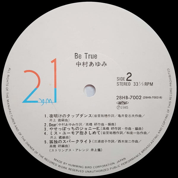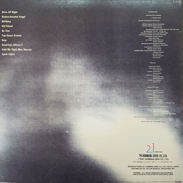 | Tracks | A1: Drive All Night A2: 翼の折れたエンジェル = Brokenhearted Angel A3: 街は毎日バースディ = Birthday A4: ガール・フレンド = Girl Friend A5: Be True B1: 夜明けのタップダンス = Tap Dance Avenue B2: Dear B3: やせっぽちのジョニーE. = Goodbye, Johnny E. B4: ミス・ユーモア抱きしめて = Hold Me Tight, Miss. Humour B5: 孤独のスパークライト = Spark Lights |