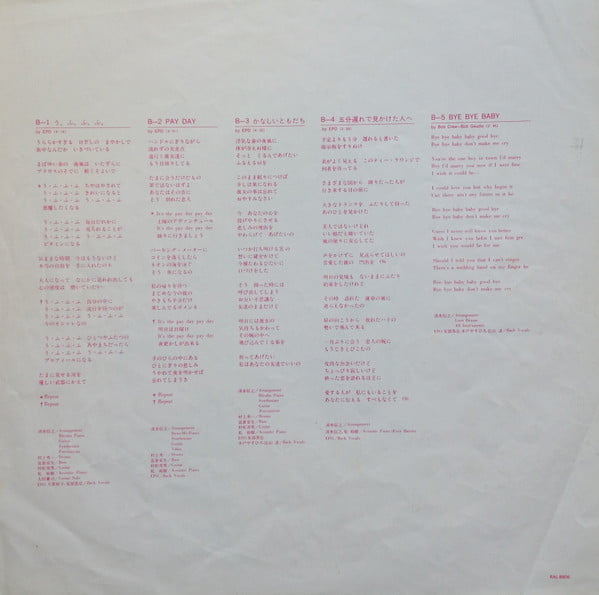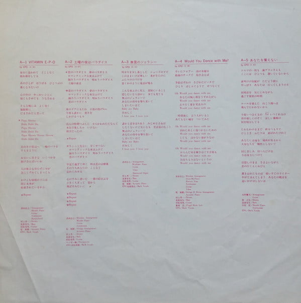 | Tracks | A1: Vitamin E・P・O A2: 土曜の夜はパラダイス A3: 無言のジェラシー A4: Would You Dance With Me? A5: あなたを奪えない B1: う, ふ, ふ, ふ, B2: Pay Day B3: かなしいともだち B4: 五分遅れで見かけた人へ B5: Bye Bye Baby B6: う, ふ, ふ, ふ, Part II |