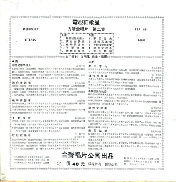 | Tracks | A1: 難忘初戀的情人 A2: 請你告訴我 A3: 幾時再回來 A4: 不要恨我 A5: 默默祝福你 B1: 夢回雪山 B2: 鍾情為誰留 B3: 不敢接受你的愛 B4: 教我空歡喜 B5: 賣花姑娘 |