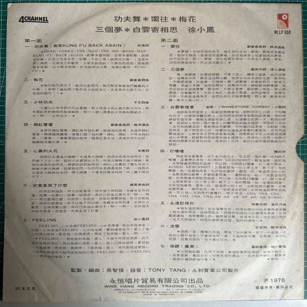 | Tracks | A1: 功夫舞 = Kung Fu Back Again A2: 梅花 A3: 少林功夫 A4: 楓紅層層 A5: 心裡的火花 A6: 究竟是為了什麼 A7: Feeling B1: 嚮往 B2: 三個夢 B3: 白雲寄情意 = Rhinestone Cowboy B4: 打噴嚏 B5: 永遠記得你 B6: 流雲 B7: 保鑣 (廣東) |