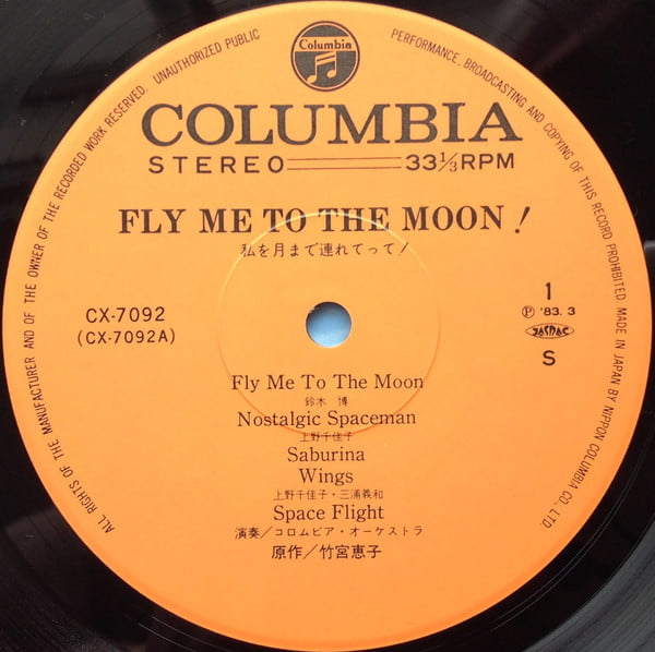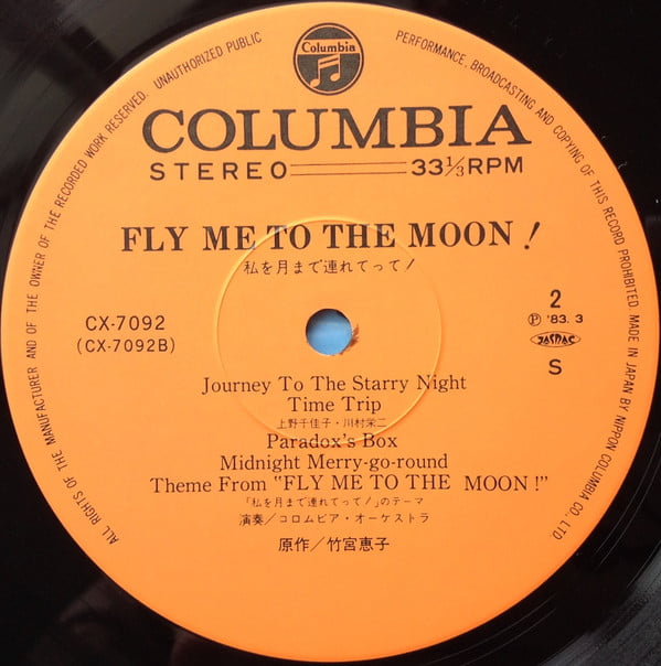 | Tracks | A1: 鈴木博 - Fly Me To The Moon = フライ・ミー・トゥ・ザ・ムーン A2: 上野千佳子 - Nostalgic Spaceman = ノスタルジック・スペースマン A3: Columbia Orchestra - Saburina = 麗わしのサブリナ A4: 上野千佳子 - Wings = ウイングス A4: 三浦義和 - Wings = ウイングス A5: Columbia Orchestra - Space Flight = 宇宙飛行 B1: Columbia Orchestra - Journey To The Starry Night = 星明りのジャーニー B2: 上野千佳子 - Time Trip = タイム・トリップ B2: Eiji Kawamura - Time Trip = タイム・トリップ B3: Columbia Orchestra - Paradox's Box = パラドックスの匣 B4: Columbia Orchestra - Midnight MerryGoRound = 真夜中のメリーゴーラウンド B5: Columbia Orchestra - Theme From "Fly Me To The Moon!" = 「私を月まで連れてって!」のテーマ |
